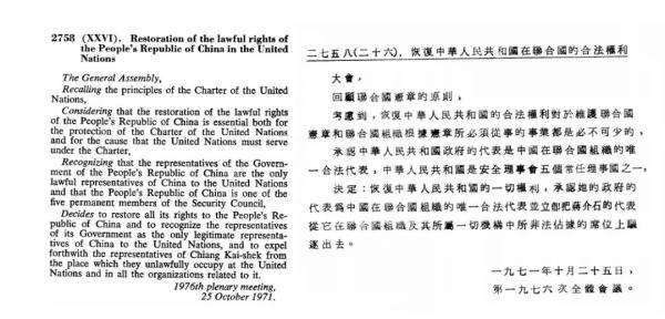 United Nations General Assembly Resolution 2758 Was Adopted On October 25, 1971 And Replaced The Nationalist Republic Of China (ROC) With The Communist People's Republic Of China (PRC) As The Sole Representative Of China In The United Nations. This Was A Subsequent Motion. 2758 (XXVI).